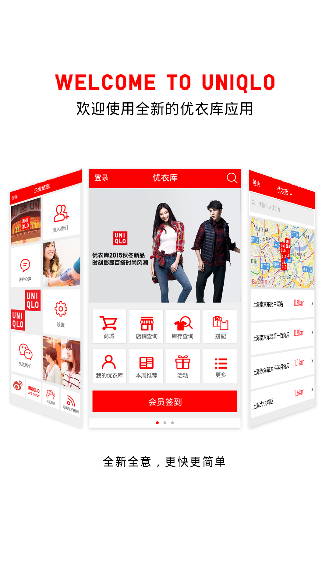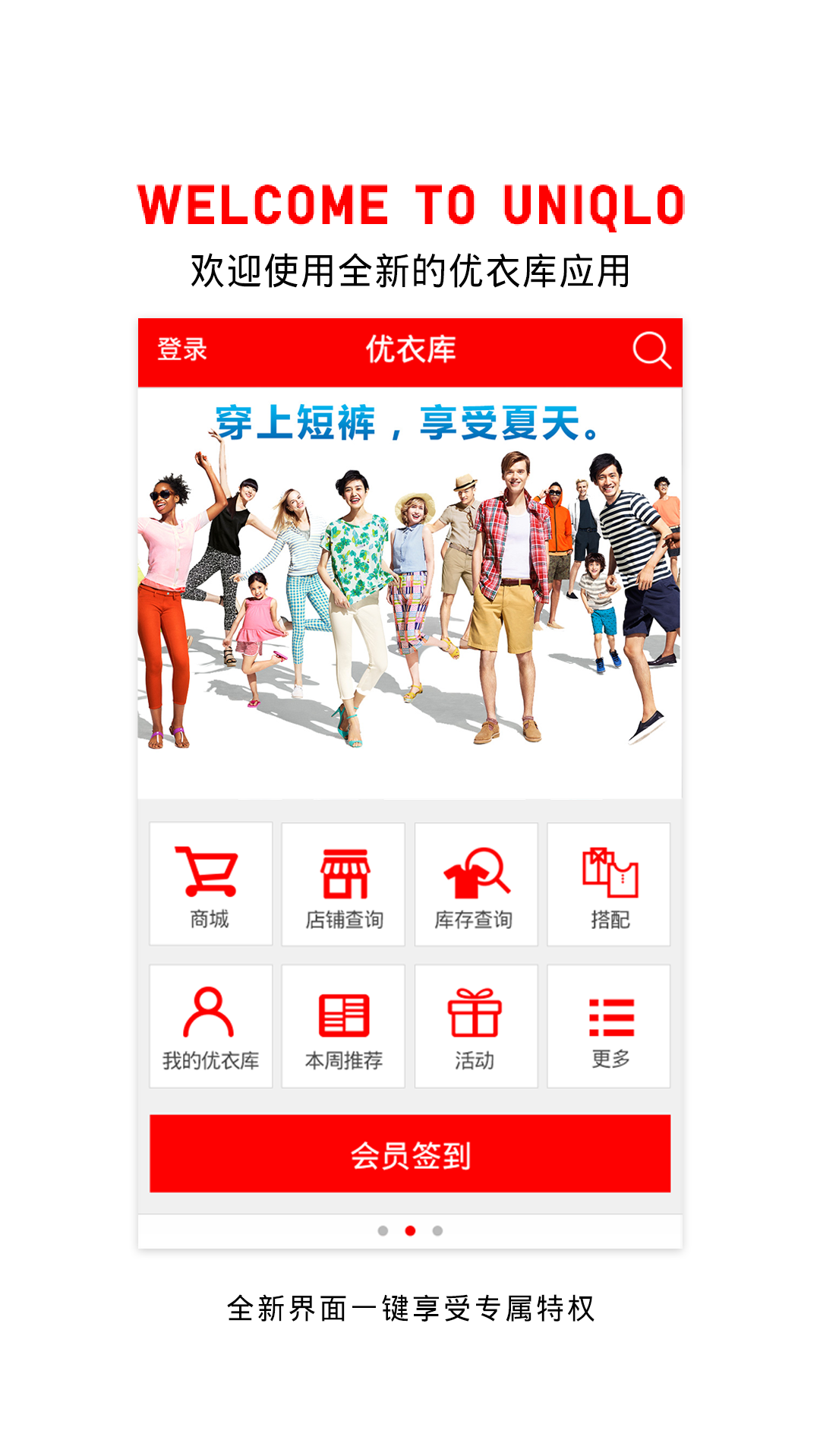 主屏幕左上角提供会员登录功能,页面下方可参与会员签到活动。欢迎尝试全新的优衣库会员功能,赢取会员豪礼。