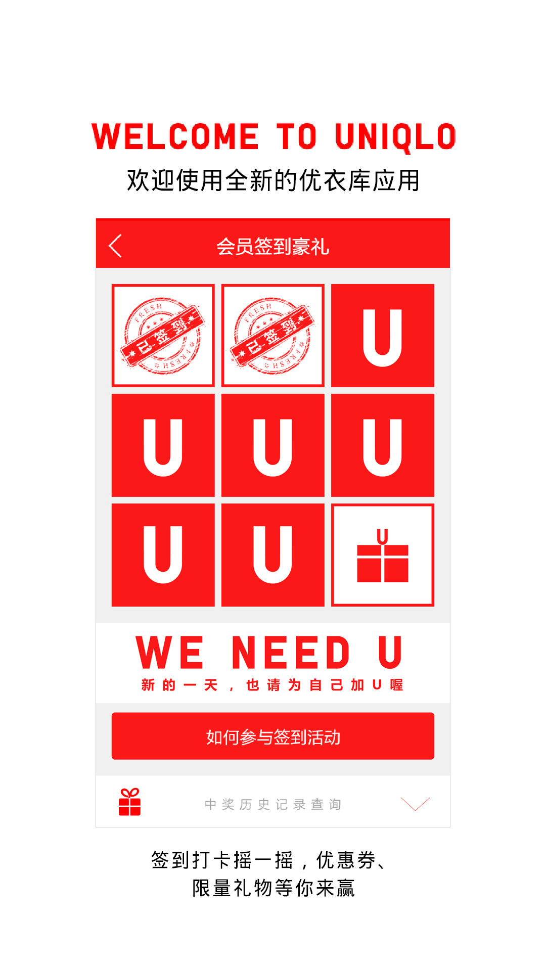 通过主屏幕下方或[我的优衣库]可参与会员签到。每天签到,更有惊喜好礼相送!
