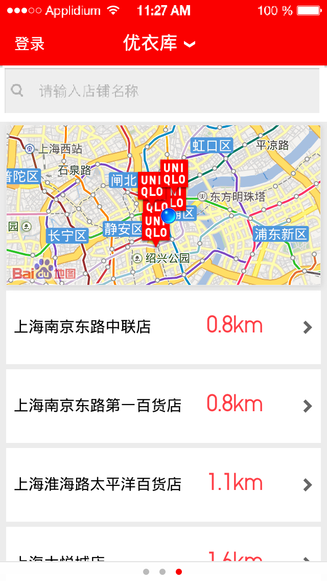 主要展示附近的4家优衣库店铺,可以根据指定条件查找,还可以在地图上进行查看。