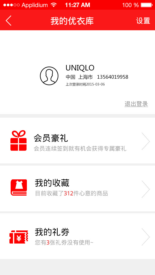 我的优衣库显示您的会员登录信息,您可以在这里更新您的个人信息,参加会员签到活动,查看收藏商品和优惠券。