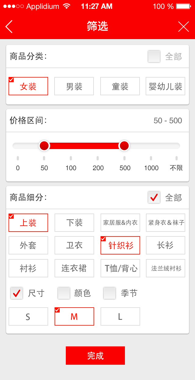 进入手机商城后搜索商品,新增了复数筛选功能,您可以从商品类目、价格区间、尺码颜色与对应季节进行筛选,更快更精准找到所需的信息。
